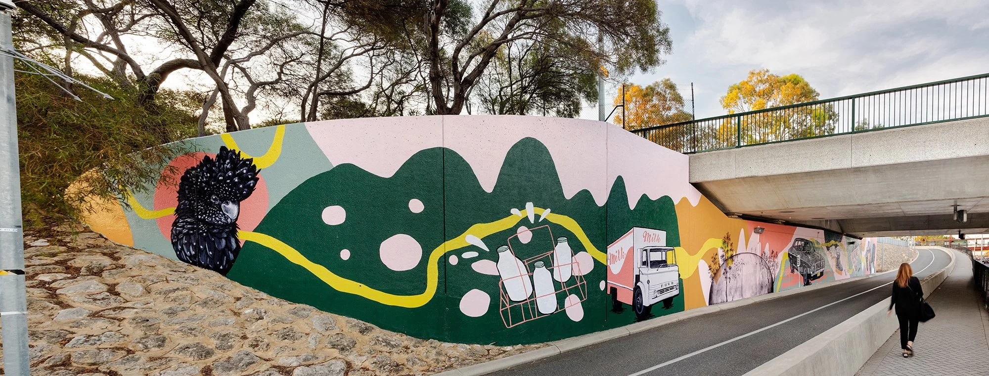 The mural’s details were shaped by the community itself. Fieldey reached out to residents through local Facebook groups, inviting them to share their favourite stories from growing up in the area. Their memories, funny, heartfelt and wonderfully specific, inspired many of the mural’s elements, including home milk deliveries, horse-shoe rolls, the Binishell dome, black cockatoos and banksias, and even the infamous creepy clown swing. These slices of local history were woven throughout the composition so the artwork feels both deeply personal and unmistakably Craigie.