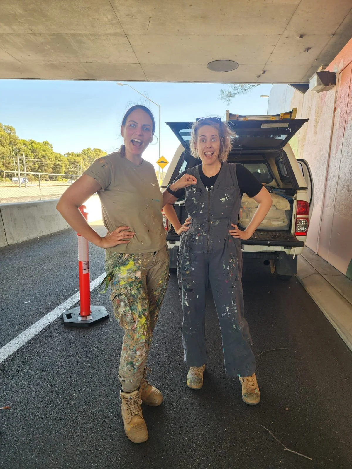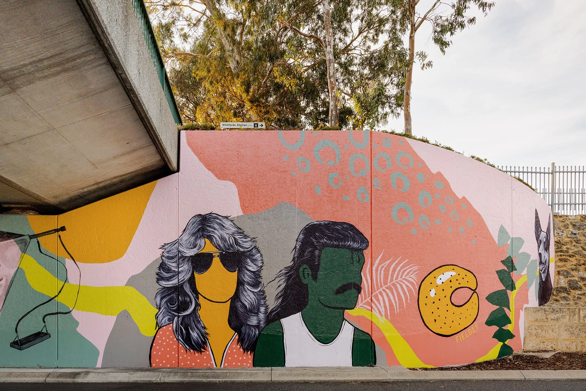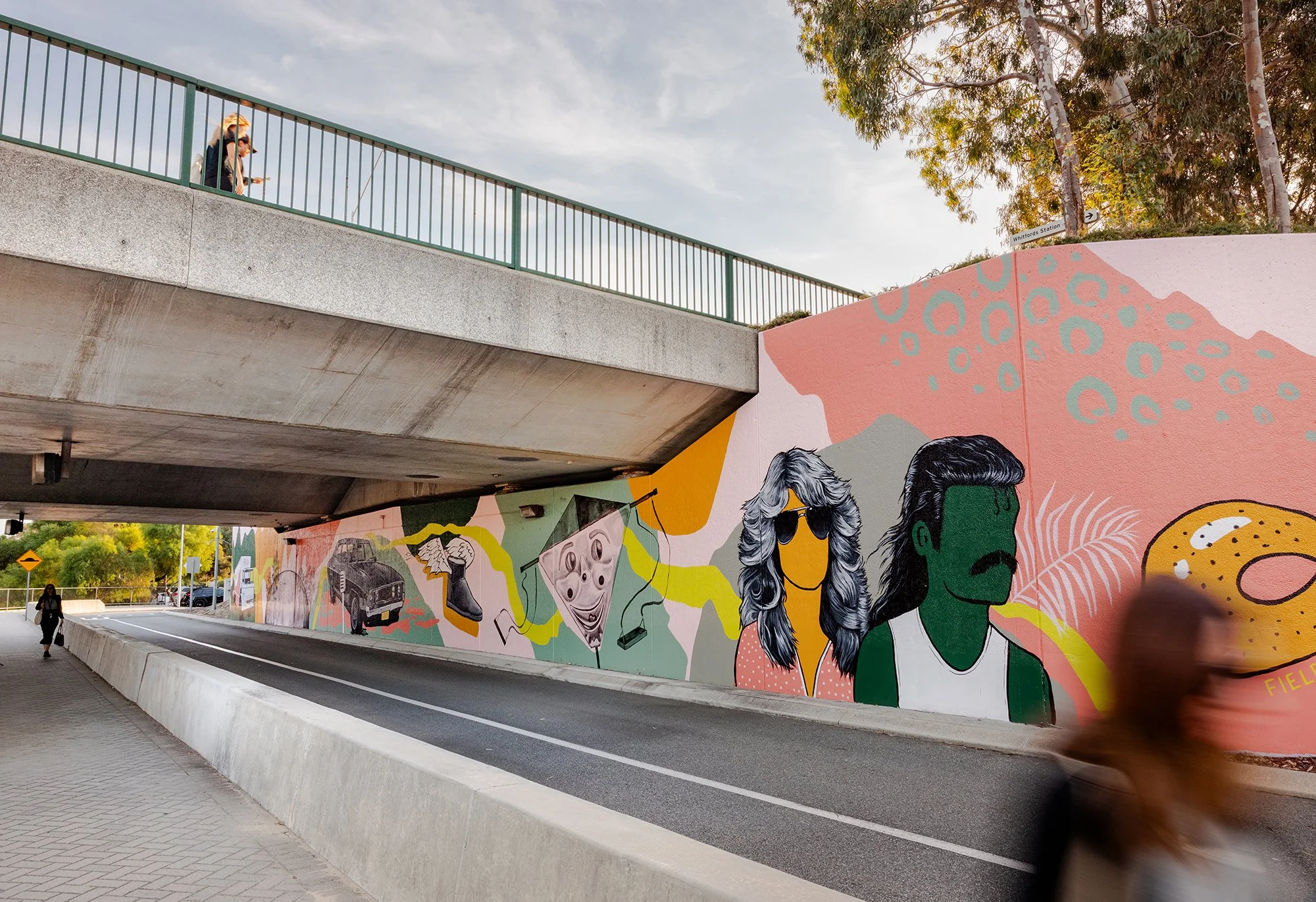 The mural was brought to life by a team of three artists over six days of painting. Together, they transformed the curved wall into a flowing visual narrative visible from both the freeway and the nearby carpark. A sweeping green line travels through the artwork, linking each vignette and symbolising both physical movement and intergenerational connection. The retro-inspired palette draws from Main Roads colour schemes for Hepburn to Whitfords and Whitfords to Ocean Reef, with an added hit of bold pink to freshen and unify the design.