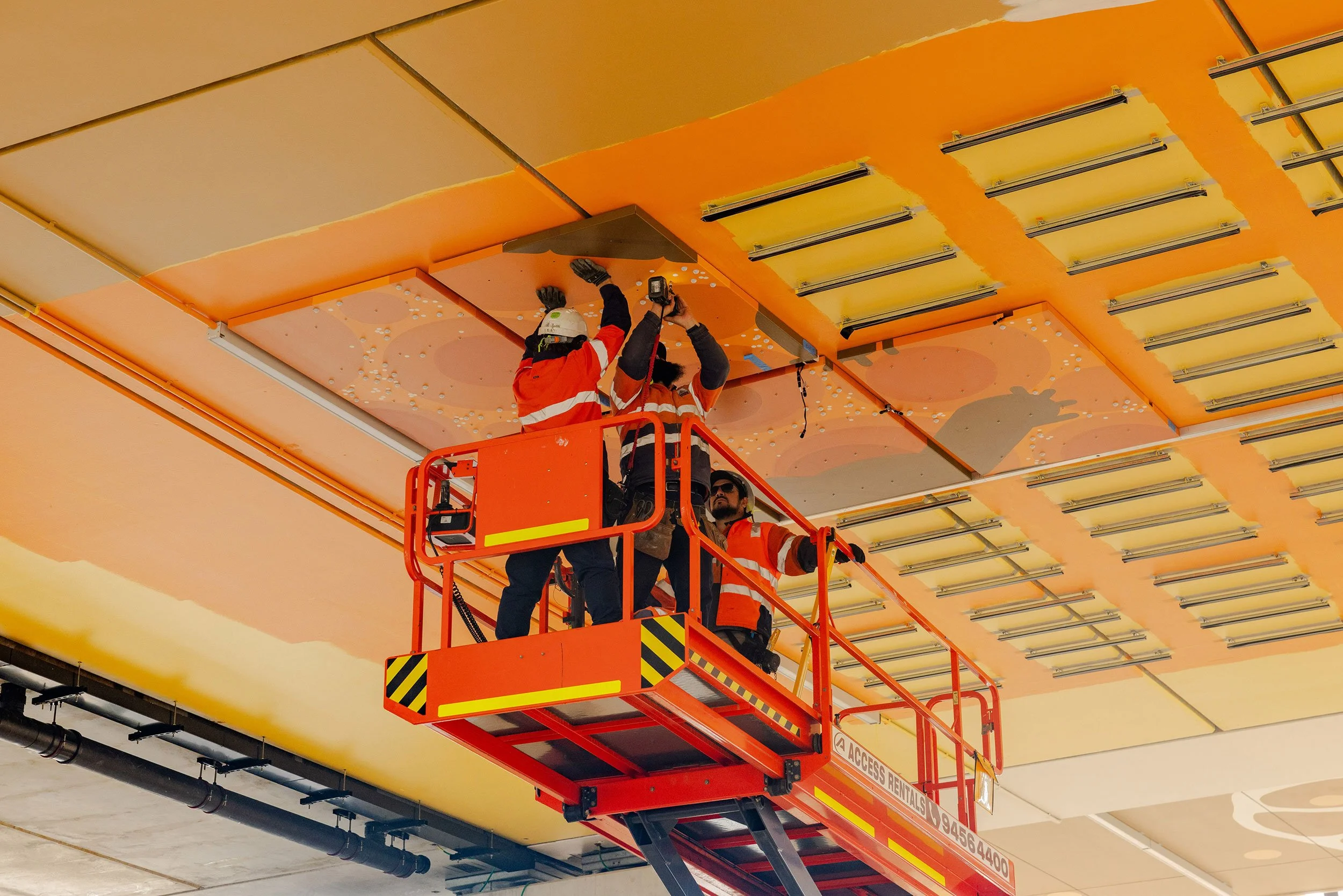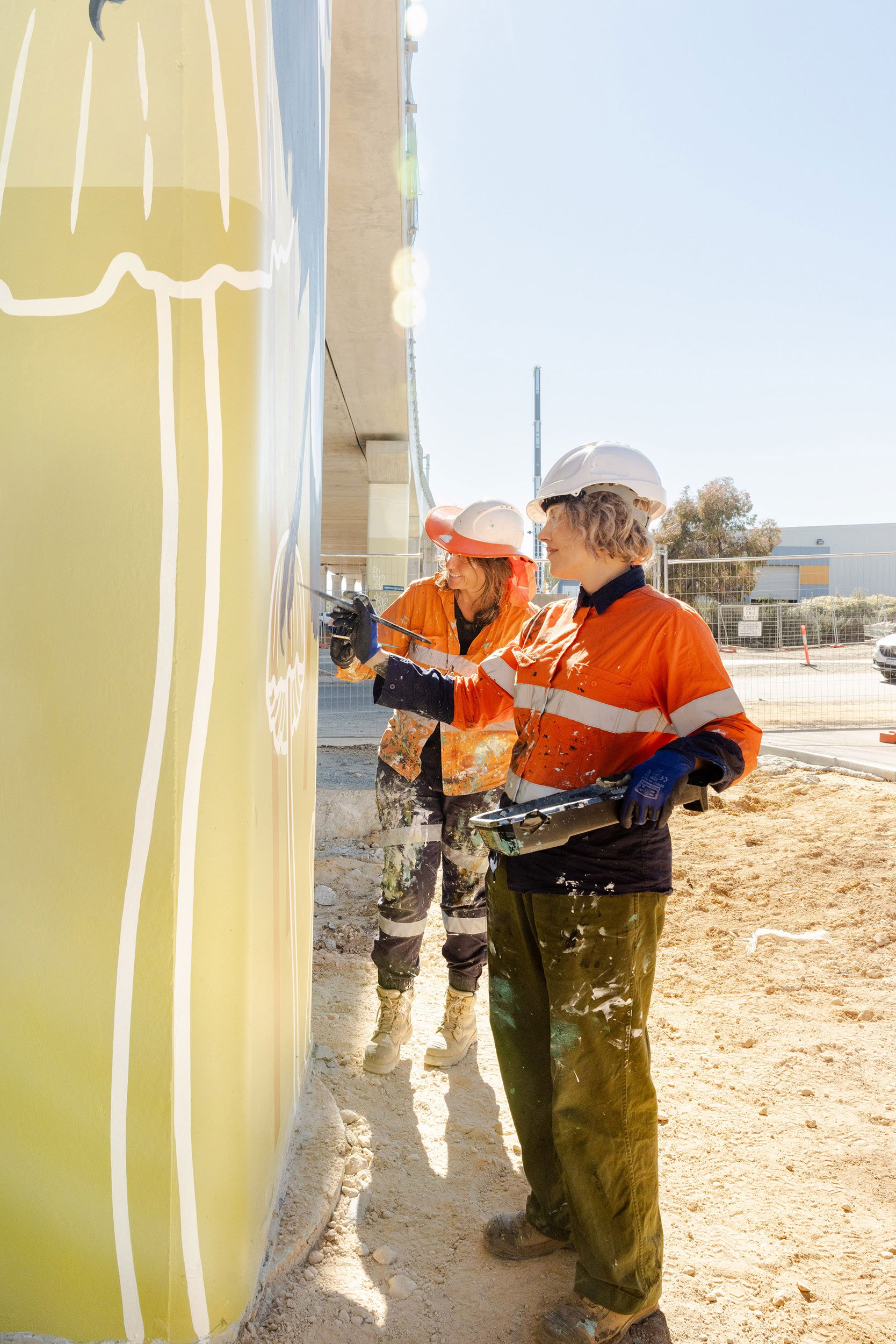 Delivering an artwork of this scale required exceptional coordination, collaboration and a clear creative vision. As co-project leads, Haylee and Mel guided the project from concept to completion, managing artists, refining the design direction, liaising with stakeholders and navigating construction constraints. Haylee acted as the project’s creative director, ensuring visual cohesion, narrative continuity and the successful integration of all artistic elements across more than 60 viaduct piers, two 30 metre retaining walls and the entire soffit ceiling. Together, they maintained a consistent artistic standard across the full length of the project.