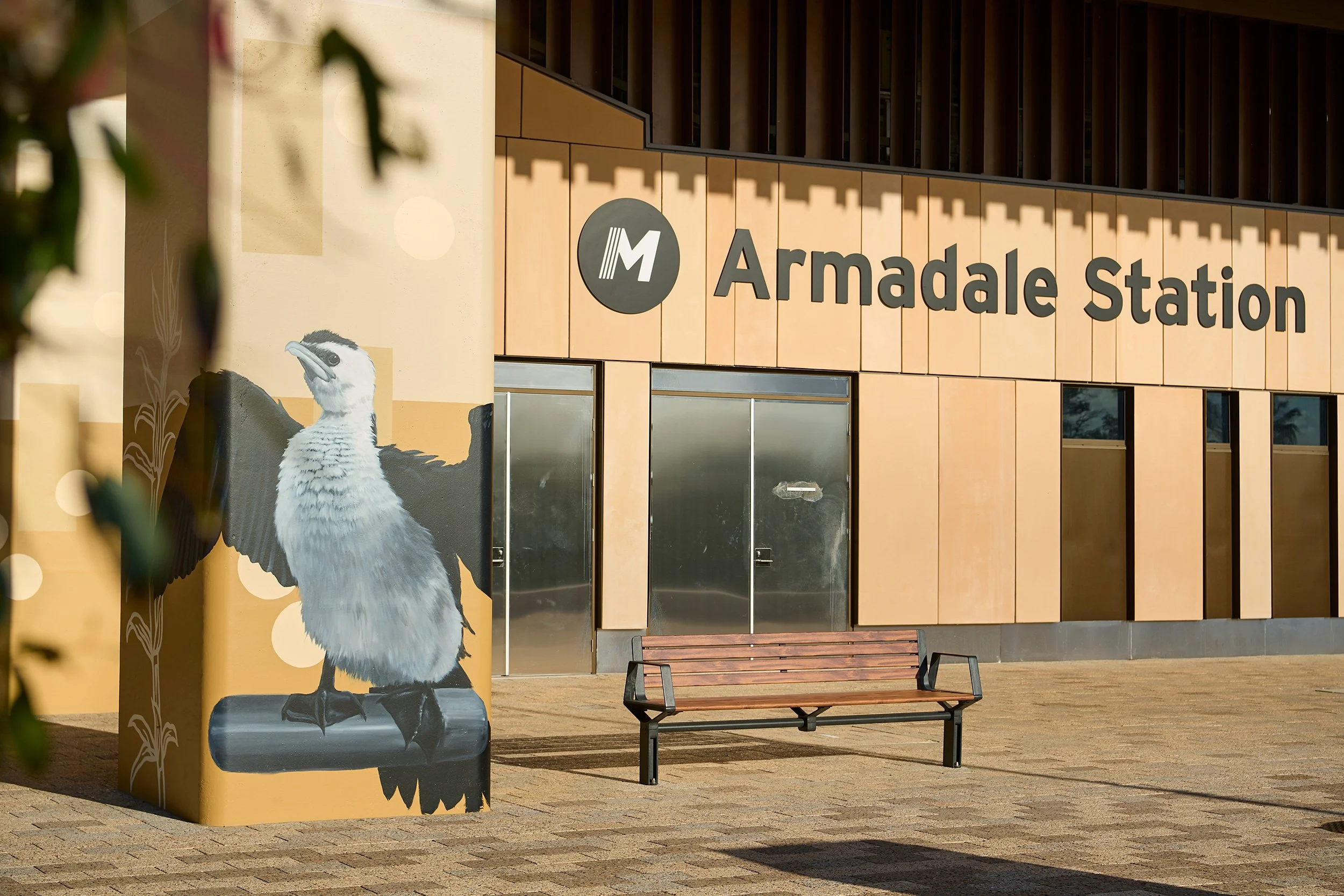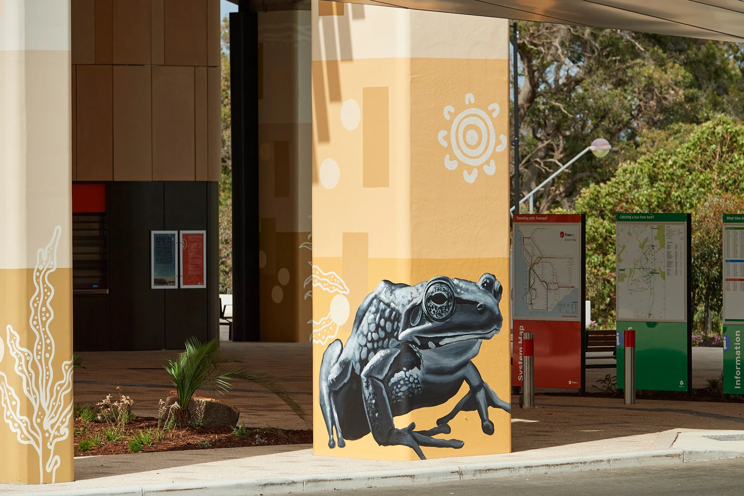 At the station entry, the soffit artwork creates a dramatic focal point. Painted across aluminium panels and concrete, it depicts a family of oblong turtles gliding through a tannin-stained stream. Thousands of programmed LED nodes, developed and delivered in collaboration with Light Application, shimmer like light reflecting on water and guide commuters naturally toward the station. This central piece celebrates Kep (water) and the three brooks that cross the line: Wungong, Cardup and Manjedal.